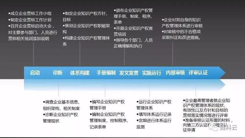 ②企业进行知识产权贯标往往不能一蹴而就,参考上文??提到的贯标流程,企业除完成上述“8步”外,还需申请第三方机构进行认证,目前全国只有中规和中知两家认证公司。