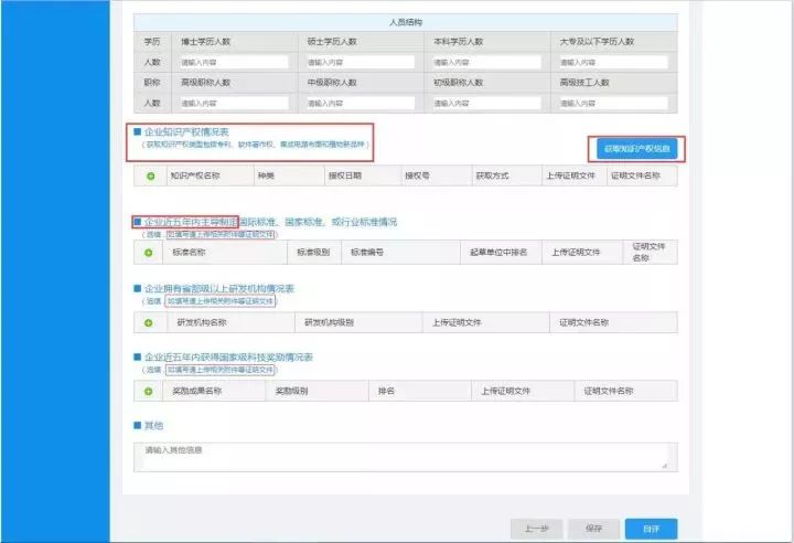(2)填写企业上一年度财务数据、企业人力资源数据、知识产权情况信息、制定的国际/国家/行业标准情况、拥有的省级以上研发机构的情况、还有获得的国家级科技奖励情况;
